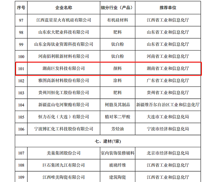 湖南巨发是一家专注于新型绿色环保无机颜料,集研发、生产、销售及服务于一体的高新技术企业,并荣获高新技术企业资格及ISO9001质量管理体系认证和ISO14001环境管理体系双认证。2015年公司牵头起草(单位排名第一)的国家行业标准HG/T 4749-2014《金属氧化物混相颜料》于当年6月1日正式发布实施,2019年公司牵头起草国家绿色制造标准与团体标准《绿色设计产品评价技术规范 金属氧化物混相颜料》。团体标准T/CPCIF 0033-2019已于2019年12月1日由中国石油和化学工业联合会发布实施,绿色制造标准HG/T 5873-2021经国家工信部公告于2021年7月1日发布实施,公司产品2020年被工信部评定为绿色产品【国家工信部公布的“绿色设计产品”(第五批绿色制造名单)】。