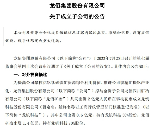 7月25日,龙佰集团公告,为提高公司攀枝花钒钛磁铁矿资源综合利用价值,推进公司铁精矿提钒产业化,龙佰集团拟与全资子公司龙佰四川矿冶有限公司共同出资2亿元在攀枝花市成立龙钒科技股份有限公司。其中龙佰集团出资0.6亿元,持有龙钒科技 30%股份,龙佰矿冶出资1.4亿元,持有龙钒科技70%股份。