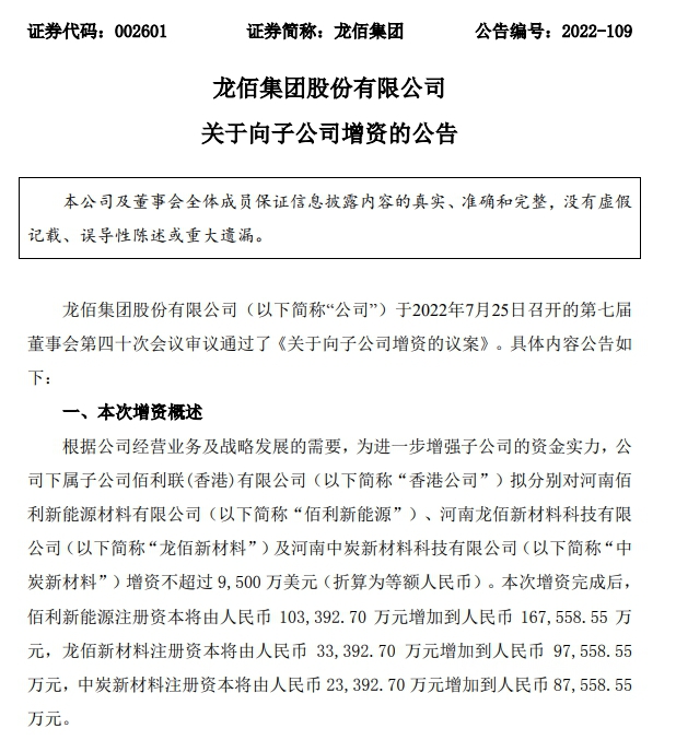 同日,龙佰集团还公告称,根据公司经营业务及战略发展的需要,为进一步增强子公司的资金实力,公司下属子公司佰利联(香港)有限公司拟分别对河南佰利新能源材料有限公司、河南龙佰新材料科技有限公司及河南中炭新材料科技有限公司增资不超过9500万美元。