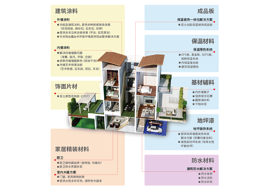 亚士成立于1998年,是一家集建筑装饰涂料、保温装饰板、防火保温材料、防水材料的研发,制造,服务于一体的高新技术企业。2017年,亚士创能(股票代码:603378)在上海证券交易所主板上市,成为中国建筑节能与装饰材料主板上市第一股。