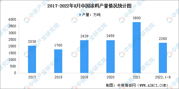 目前中国涂料的产量已经占到全球的三分之一,使亚太地区成为世界涂料产业发展的重要增长极。根据中国涂料工业协会数据,2020年涂料行业规模以上企业1968家,涂料总产量2459万吨;2021年全行业企业总产量约为3800万吨,较上年同比增长16%;2022年1-8月,我国涂料行业全行业总产量约2260万吨,较去年同期同比降低4.3%。