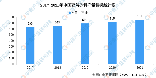 建筑涂料是涂饰于物体表面能与基体材料很好粘结并形成完整而坚韧保护膜的物料,一般由成膜物质、颜填料、溶剂、助剂组成,可以起到保护作用、装饰作用、特殊功能作用。在新建房屋建筑稳步增长以及旧房翻新的房屋涂装需求拉动之下,建筑涂料行业规模不断扩大。数据显示,2021年中国规上企业建筑涂料的产量达到了751万吨,增速为5.03%,所有企业的产量达到1140万吨。