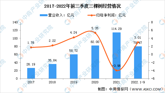 2022年前三季度,三棵树实现营业总收入79.47亿元,同比增长0.52%;归属母公司股东净利润3.01亿元,同比增长369.7%。