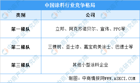 我国涂料行业集中度较低,行业梯队层次较为明显。立邦、阿克苏诺贝尔等跨国涂料集团位于行业第一梯队。专注于国内市场并逐步做大做强的部分国内品牌企业处于行业第二梯队,主要包括三棵树、亚士漆,嘉宝莉、美涂士、巴德士等。行业的第三梯队则由大量的小型涂料生产企业构成,主要通过生产低质低价产品获利,一般在生产规模、技术实力方面均处于较劣势的地位,竞争力较弱。