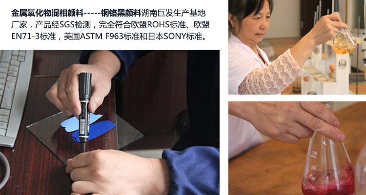 湖南巨发颜料有限公司是国内专业的金属氧化物混相颜料-----铜铬黑颜料生产基地厂家,产品经SGS检测,完全符合欧盟ROHS标准、欧盟EN71-3标准,美国ASTM F963标准和日本SONY标准。