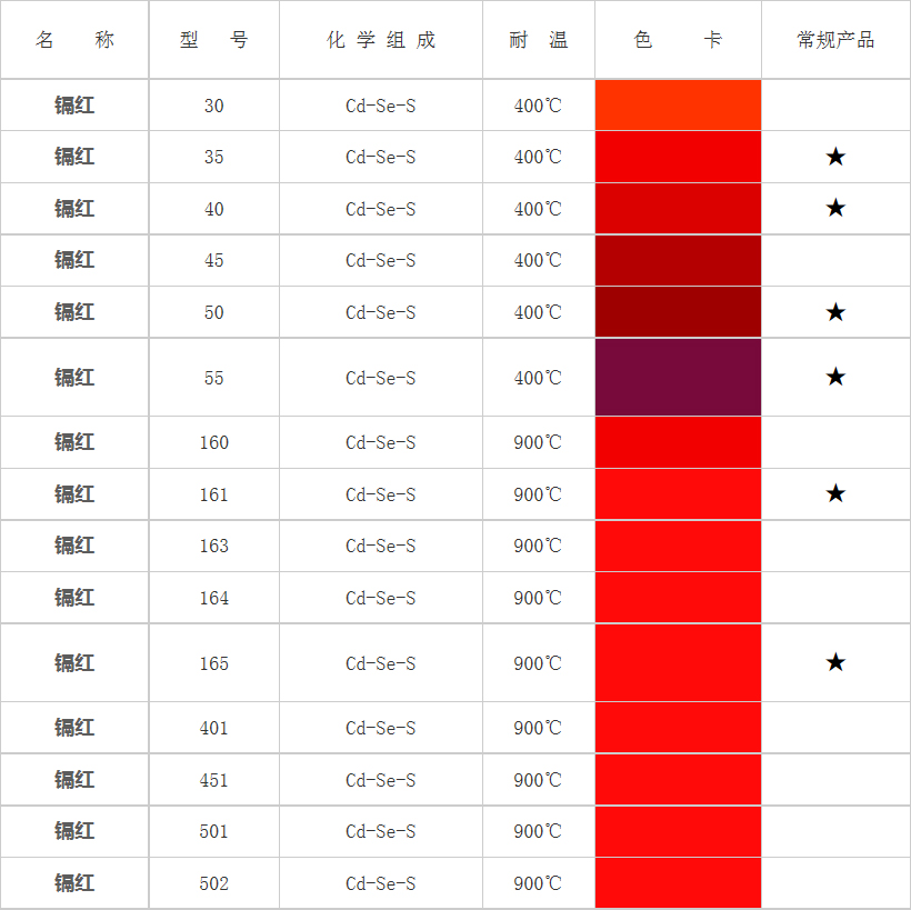 (1)镉红是搪瓷、陶瓷、玻璃工业首选的红色颜料。镉红还广泛用于塑料、色母粒、陶瓷、涂料、造纸、橡胶、皮革、美术颜料、艺术凹版油墨、彩色砂石建筑材料、电子材料等行业。