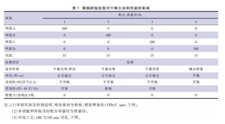 本研究采用4种两步法合成的饱和端羧基聚酯树脂(以下简称为树脂A、树脂B、树脂C、树脂D)进行实验。4种树脂的酸值(mgKOH/g)依次分别为20~30,30~45,45~55,55~65。以异氰脲酸三缩水甘油酯(TGIC)为固化剂,选用通用型流平剂、安息香、固化促进剂、抗氧剂和颜料,不添加填料配制粉末涂料,对比了不同类型聚酯树脂对涂膜性能的影响,结果如表1所示。