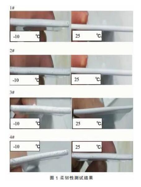 表3数据表明,4种增韧助剂对于涂层柔韧性增强效果不同。其中助剂1的作用效果相比于其他3种助剂要更好。添加了助剂1之后,涂层的柔韧性得到了提高,未添加前涂料涂层在-10℃下冷藏1h后涂层0T弯时,折弯处有微小的裂痕,而添加之后,情况大有改善,此项性能也达到了预期的涂层柔韧性性能要求。致使涂层韧性大为改善的原因可能是热塑性弹性体助剂1在参与固化反应过程中,在树脂与固化剂形成的交联网络中形成了半互穿的网络结构,使得涂层的柔韧性大大地提高了;而其余3种增韧助剂,对于涂层柔韧性的提高并不显著。综合考虑,故选择助剂1作为本研究涂料产品的增韧助剂。图2为实验结果照片。
