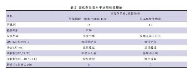 固化剂是粉末涂料的重要组成部分,它对涂料的生产,运输储存以及应用性能都有着重要作用。目前聚酯树脂用固化剂有以下几类,分别是三聚氰胺树脂、封闭型异氰酸酯、异氰脲酸三缩水甘油酯(TGIC)、酸酐、羟基酰胺类物质等,其中目前应用最为广泛的是异氰脲酸三缩水甘油酯(TGIC)和羟基酰胺类物质。实验过程中以树脂B作为主体树脂,选用通用型二氧化钛、流平剂、安息香、抗氧剂、固化促进剂和颜料,对比了异氰脲酸三缩水甘油酯(TGIC)和羟基酰胺类物质2种固化剂对于涂膜性能的影响。涂膜厚度在(150±5)μm。