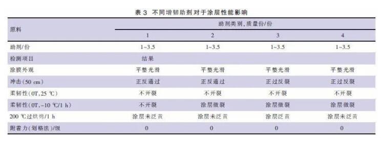 通过前期试验与研究,选用的4种对于涂层的柔韧性等性能均具有不同程度的影响,因此决定通过进一步的实验,全面分析者4种增韧助剂的综合性能,进而找到我们想要的助剂种类。为了进一步探究增韧助剂对于涂料涂层性能的影响,试验以聚酯树脂B作为树脂体系;TGIC作为固化剂,选用通用型二氧化钛、流平剂、安息香、抗氧剂、固化促进剂和颜料,对比了4种增韧助剂(助剂1、助剂2、助剂3、助剂4)对于涂层性能的影响。其中,增韧助剂1为热塑性弹性体,参与反应;增韧助剂2、3为橡胶类增韧剂,参与反应;,增韧助剂4为非活性增韧剂,不参与反应;结果如表3所示。表中聚酯树脂200份,TGIC为11份,二氧化钛为80份,通用型流平剂为2.2份、安息香为2份、抗氧剂1.5份、固化促进剂0.8份、颜料适量,固化条件180℃/10min,涂膜厚度在(150±5)μm。