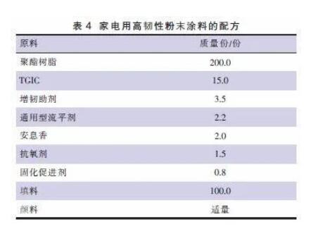 综上所述,应用于家电用高韧性粉末涂料配方如表4所示。涂膜厚度在(150±5)μm,固化工艺:180℃/10min固化。