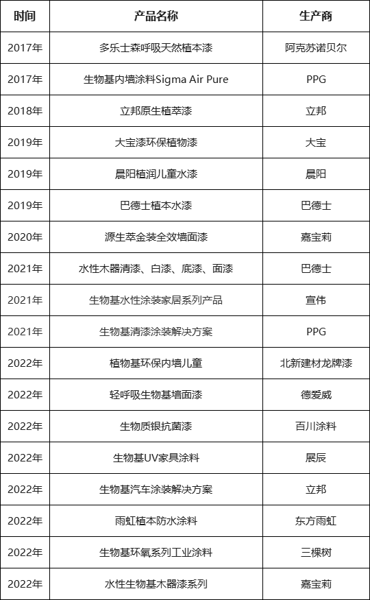 近年来中国发布的部分生物基涂料产品