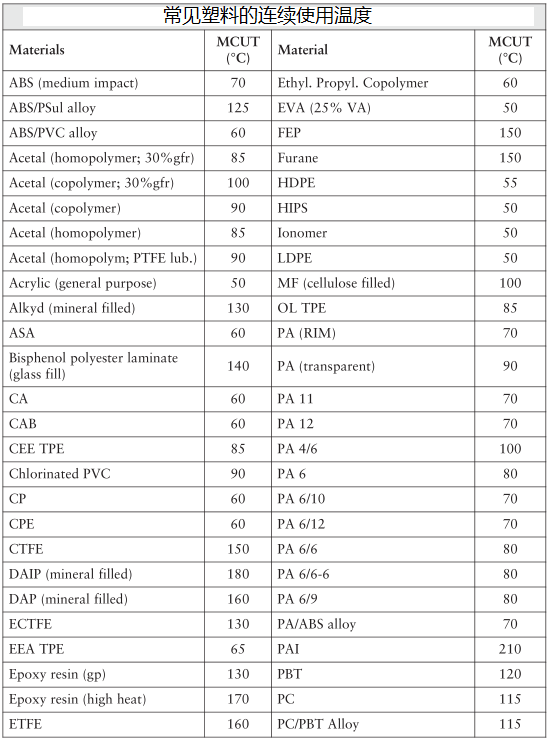 对于任何给定的聚合物类型,UL 指数或 MCUT 将涵盖一系列值,具体取决于抗降解保护的质量。下表列出了塑料和橡胶的“通用最小值”值,这些值可用于具有最低保护(即通常需要在加工条件下稳定材料)的商业等级。尽管通常未指定添加剂的类型和浓度掩盖了聚合物化学的详细影响,但大致的优劣顺序仍然很明显。