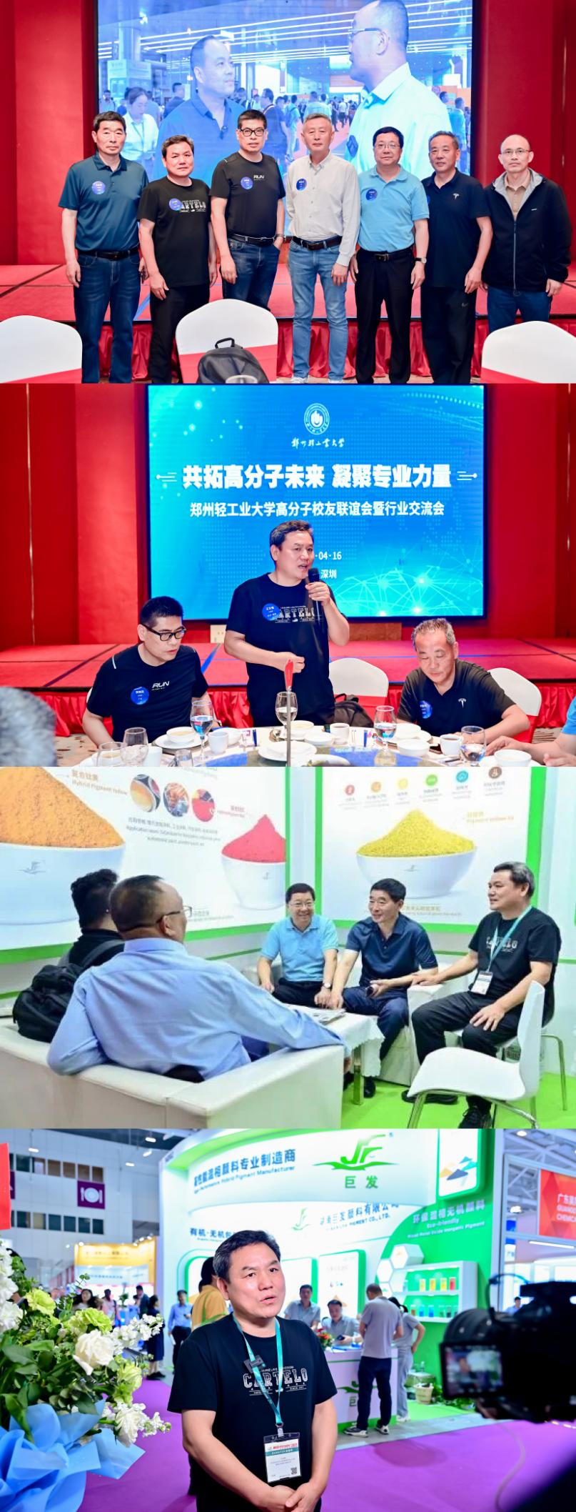 4 月 15 日,郑州轻工业大学的白宝丰老师,携手广东校友会会长贾国忠、江苏校友会会长王洪涛以及上海校友会副会长毕宏达等一行人,怀着对校友企业发展的关切之情,专程参观了展会内的优秀校友企业展厅。他们逐一深入新秀化学、巨发颜料、株洲时代、康斯坦普、龙宇化工、郑州圣莱特、银金达、爱士德热流道等企业展位。在参观过程中,他们通过面对面的实地访谈,与企业负责人深入交流,细致了解企业的创新成果;同时,利用拍摄记录的方式,留存企业在各领域的突出成就。
